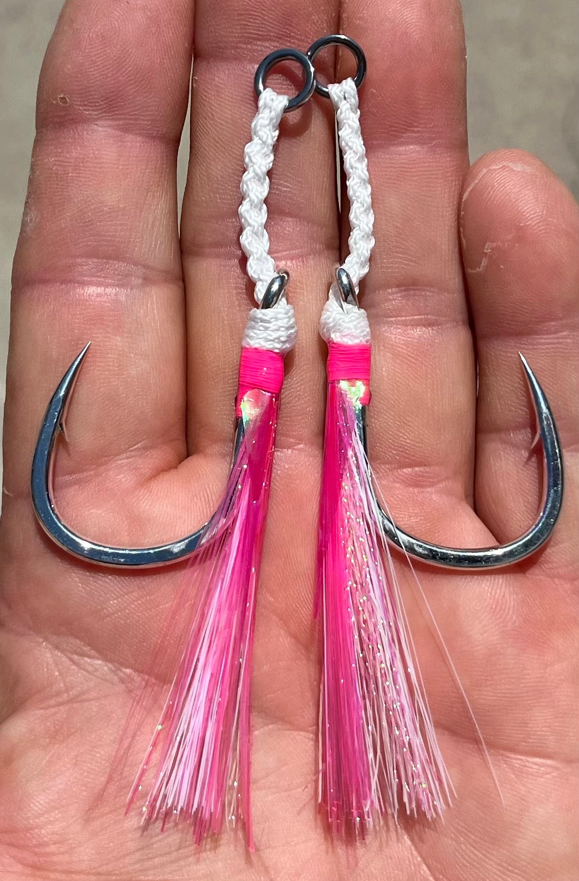 These BKK Pink Flash 7/0 Assist Hooks are 5X strong and deliver both pro-grade strength and attraction. Featuring razor-sharpness , heavy rope rated to 350 lb, and bright glow fibers that light up in the dark, it’s built to get bit when the tuna are feeding deep or at night. A proven strike trigger. If you fishing for cow tuna this is the hook to use.