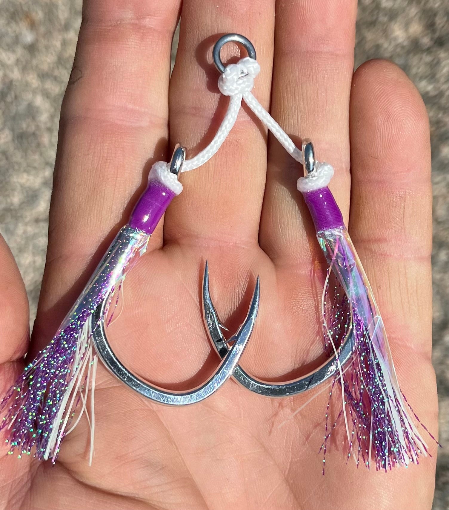 These BKK Purple Flash 7/0 Assist Hooks are 5X strong and deliver both pro-grade strength and attraction. Featuring razor-sharpness , heavy rope rated to 350 lb, and bright glow fibers that light up in the dark, it’s built to get bit when the tuna are feeding deep or at night. A proven strike trigger. If you fishing for cow tuna this is the hook to use.
